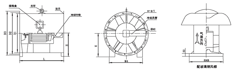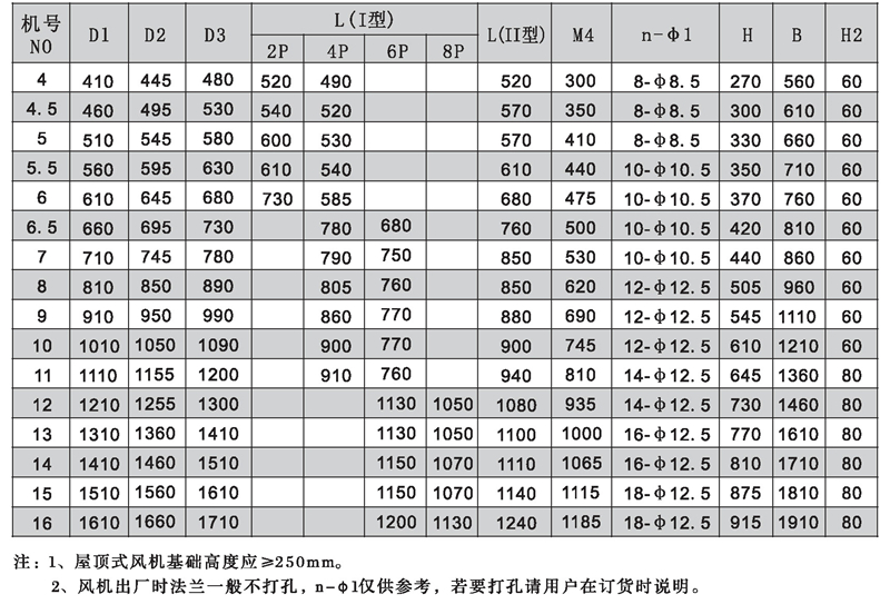 注: HTF型可根據(jù)需要制成消音型(進出風端加置專用消聲器) ;表示方法: 機號后面加字母“X”。HTF型均可制成屋頂式,表示方法:機號后面加字母“W”